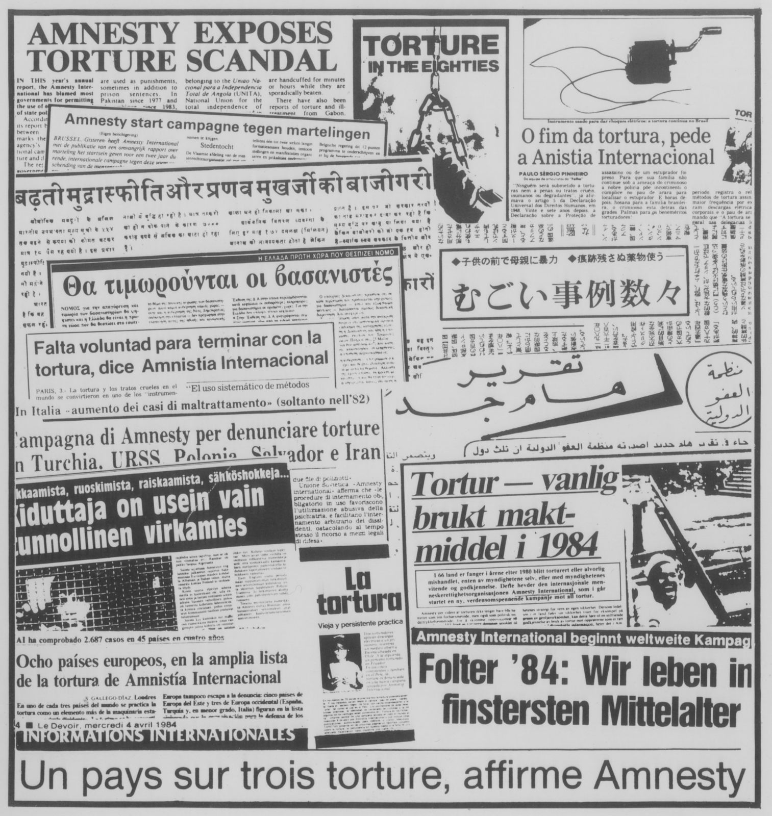 První celosvětová kampaň Amnesty za zrušení mučení byla zahájena 10. prosince 1972 u příležitosti Mezinárodního dne lidských práv s cílem zastavit mučení – stejně jako například otroctví. Amnesty vyzvala Valné shromáždění OSN, aby okamžitě zakázalo mučení vězňů na celém světě. Tato petice s více než milionem podpisů vedla k tomu, že Valné shromáždění přijalo rezoluci vyjadřující vážné znepokojení nad mučením a v roce 1973 se uskutečnila mezinárodní konference v Paříži, kde byla přijata řada doporučení a opatření.