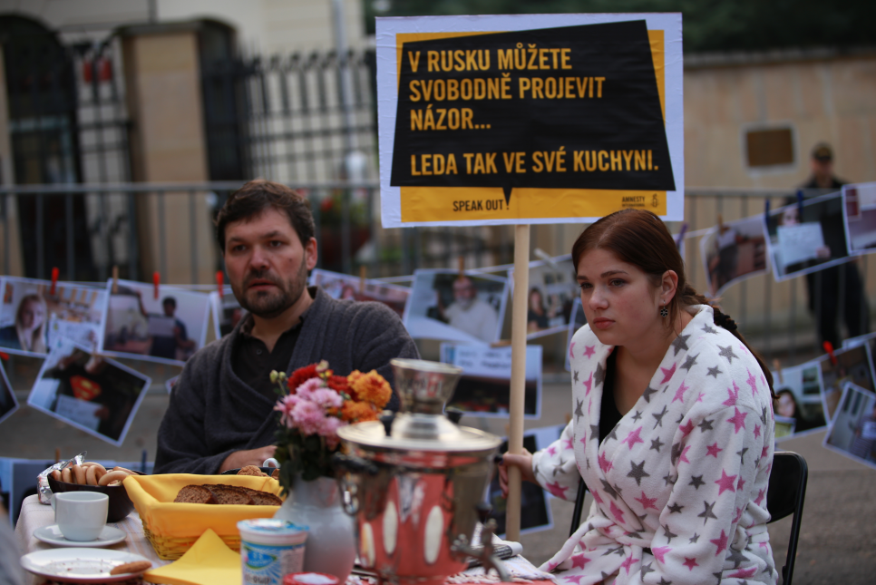 „V Rusku můžete svobodně projevit názor leda tak ve své kuchyni,“ říkají sami Rusové. Od roku 2012, kdy byl Vladimir Putin potřetí zvolen ruským prezidentem, prošla Státní dumou řada kontroverzních zákonů, které hrubě porušují práva Rusů. Amnesty se na nesvobodu v Rusku rozhodla upozornit netradičním způsobem, ne hlasitou demonstrací, ale klidným a tichým protestem před ruskou ambasádou. V naší improvizované kuchyni byly k vidění stovky fotografií od veřejnosti, kdy se lidé sami fotili ve své kuchyni a upozornili tak na situaci v Rusku. Happening získal velkou pozornost médií.