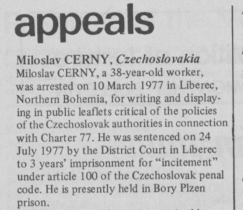 Týkala se těžce nemocného vězně svědomí Miloslava Černého z Liberce. Ten byl odsouzen na tři roky vězení za trestný čin „pobuřování“. Po kampani se jeho podmínky věznění a lékařská péče zlepšily. Téhož roku byly vyhlášeny ještě tři další spěšné akce (nyní jim říkáme urgentní akce), týkající se dalších obětí porušování lidských práv v Československu.