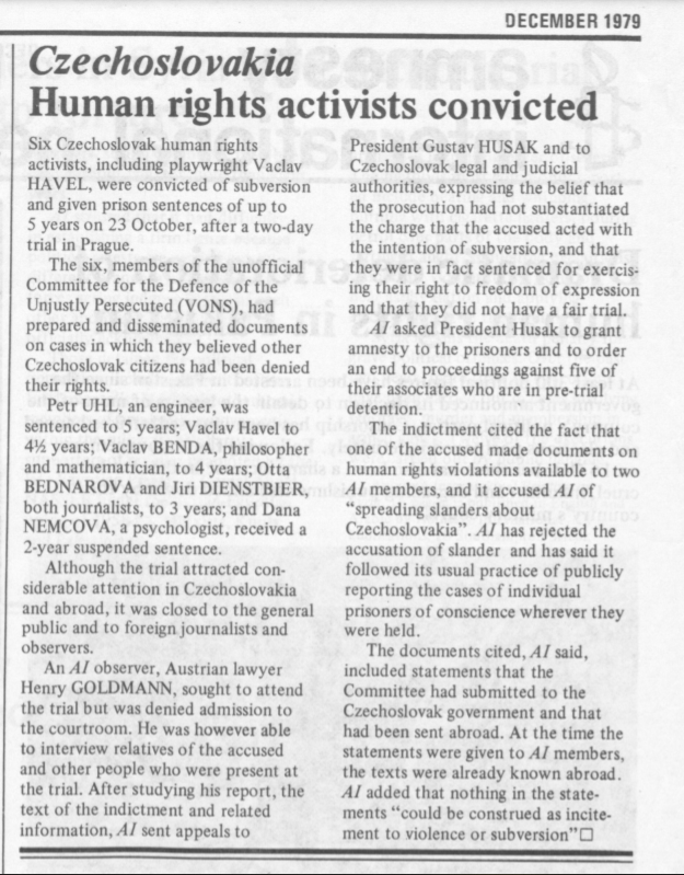 "Otevřete noviny kterýkoliv den v týdnu a narazíte na zprávu odněkud ze světa o člověku, který byl uvězněn, mučen nebo popraven, protože jeho názory či náboženská víra byly pro tamní vládu nepřijatelné. Takových lidí jsou ve věznicích miliony – v žádném případě přitom nejsou všichni jen za železnou nebo bambusovou oponou – a jejich počty se dále zvyšují. Čtenář těchto zpráv je právem zhnusený pocitem vlastní bezmoci. Ovšem pokud bychom tyto pocity znechucení lidí po celém světě mohli spojit a promítnout do společné akce, může to přinést výsledky."
