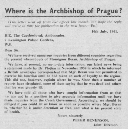 Zajímavostí je, že jedním z první šestice „Zapomenutých vězňů“ z článku Petera Benensona byl i pražský arcibiskup Josef Beran, v té době pronásledován totalitním režimem v Československu a držen již dvanáctým rokem v přísné internaci. Sean MacBride z pověření Amnesty v únoru 1962 navštívil Prahu, aby zjistil podrobnosti o případu arcibiskupa Berana a několika dalších vězňů. Setkal se se zástupcem ministra zahraničí, kontakt přímo s arcibiskupem Beranem mu však nedovolili. Vládnoucí moc argumentovala tím, že arcibiskup je „zaneprázdněn psaním a návštěva by ho vyrušovala“.