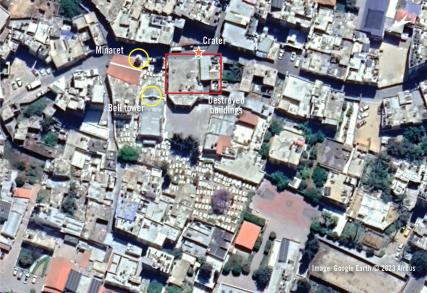 Krizová laboratoř Amnesty International prozkoumala, ověřila a geolokačně zaměřila videa a snímky zveřejněné na sociálních sítích, které zachycují bezprostřední následky útoku, a analyzovala satelitní snímky místa před úderem a po něm. Všechna šetření potvrdila zničení jedné budovy a částečné zničení další budovy v areálu kostela.