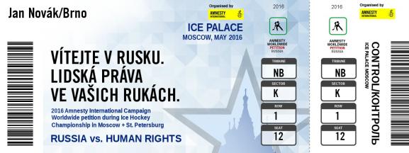 1/ Lístek na lidskoprávní zápas na stadionu: česká Amnesty připravila online aplikaci hokejového stadionu, kde mezi diváky sedí tři vězni svědomí – lidé věznění jen za svoje názory a přesvědčení – a sledují pomyslný lidskoprávní zápas na kluzišti. Lidé si můžou vybrat sedadlo vedle jednoho z nich – Natálie Šarinové, ředitelky knihovny stíhané za údajnou distribuci extremistické literatury, Ildara Dadina, aktivisty odsouzeného za veřejné shromáždění nebo Darji Poljudové, lidskoprávní advokátky perzekvované za příspěvky na sociální síti. Výběrem sedadla dostane návštěvník webu možnost podepsat petici za propuštění těchto nespravedlivě stíhaných a taky sdílet svůj lístek na zápas Rusko vs. lidská práva na Facebooku. Stadion se otevřel divákům ve středu 4. května ve 12 hodin. Najdete ho na https://amnesty.cz/jsmevjednomtymu/. Všechny „koupené“ lístky po mistrovství vytiskneme a pošleme spolu s peticemi ruským úřadům