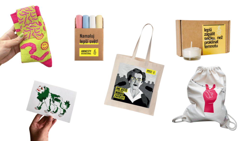 Každý člen Amnesty Kolektivu obdrží slevový kód, který najde v příloze děkovného e-mailu po přijetí daru. Kód vám umožní nakoupit se slevou 20 % na našem e-shopu. V něm najdete skvělý merch, kterým můžete dát všem okolo najevo, že patříte k těm, kdo brání lidská práva.