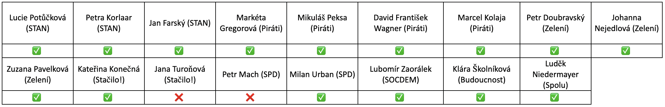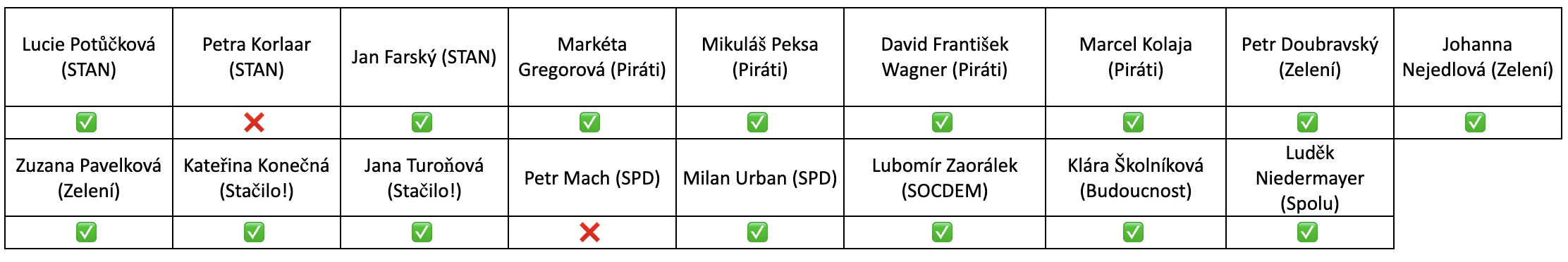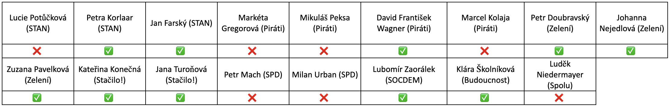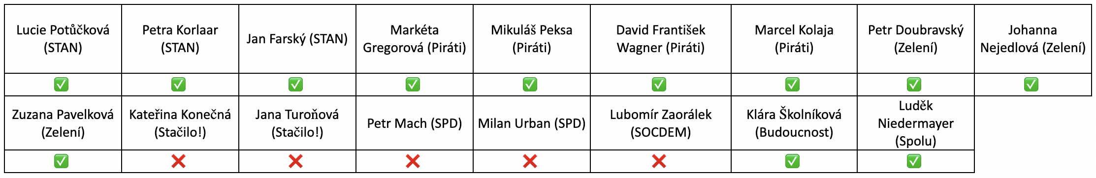 V rámci průzkumu oslovila Amnesty kandidáty ANO, Spolu, Pirátů, STAN, Zelených, koalice SOCDEM a Budoucnosti, Stačilo! a koalice SPD a Trikolory. Na zaslané dotazy však žádní kandidáti z řad ODS, KDU-ČSL, ANO a Trikolory nereagovali. Odpověď „Ano“ je zaznačeno symbolem ✅, odpověď „Ne“ symbolem ❌.
