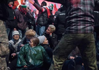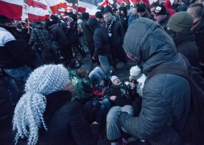 To, s čím se tam setkaly, bylo hluboce znepokojující. Stovky lidí mávající rasistickými a fašistickými symboly, vzkazy proklamující, že „Evropa bude bílá nebo prázdná“, a členové krajních pravicových skupin a jejich sympatizanti držící světlice a házející petardy. Ženy se nenechaly zastrašit agresivní atmosférou a rozvinuly svůj vlastní transparent, který hlásal „Stop fašismu“.