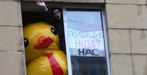 administrativní vazby na 25 dní za vystavení obrovské nafukovací kachny v okně