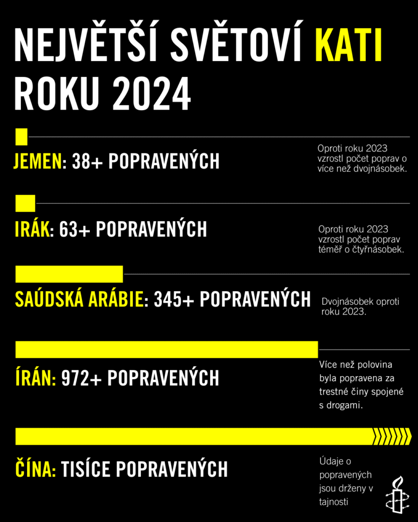 Největší podíl na nárůstu poprav za roku 2024 mají Írán, Irák a Saúdská Arábie, které dohromady vykonaly 1 380 poprav.