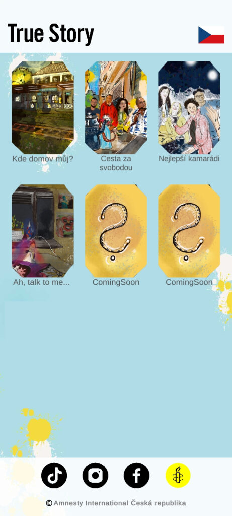 Díky hře TRUE STORY se můžete stát třeba bezdomovcem, uprchlíkem, autistkou nebo obětí znásilnění. Zjistěte, s čím vším se potýkají, jaké situace prožívají a před jakými volbami stojí. Aplikace vznikla s cílem prevence diskriminace, rasismu a xenofobie a je součástí vzdělávacích aktivit Amnesty International.
