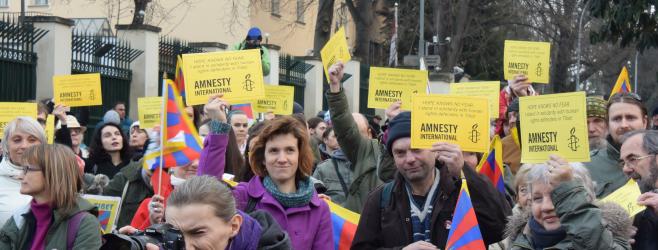 Na tradiční akci před čínskou ambasádou dorazily desítky lidí a vyjádřily svůj nesouhlas s porušováním lidských práv v Číně a Tibetu.